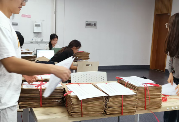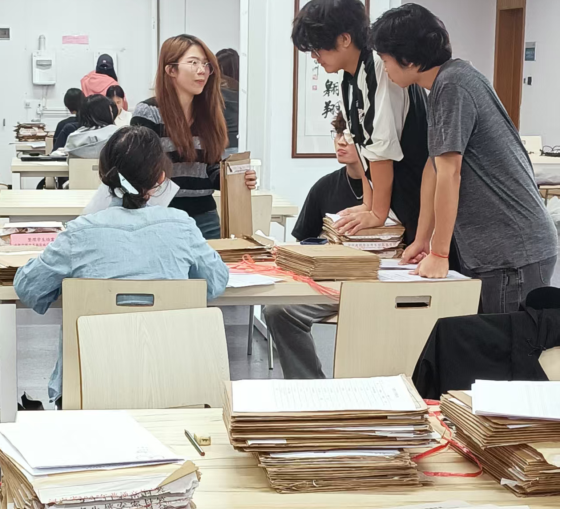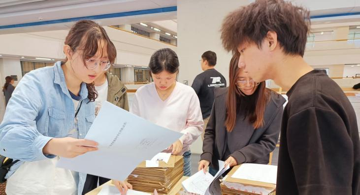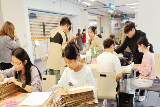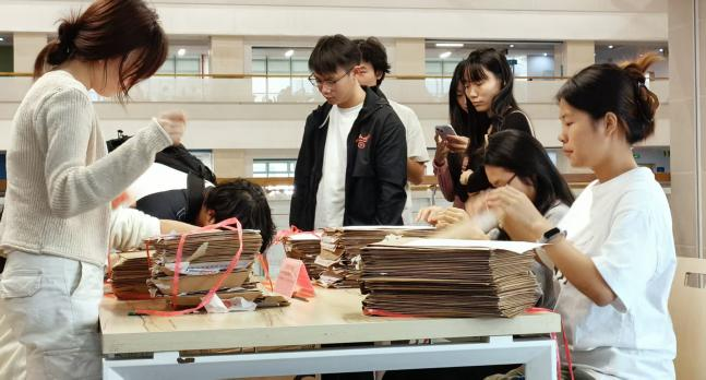 在档案移交入库的关键环节,一场严谨而细致的现场核验工作在档案馆展开。档案馆学生助理对每份档案进行逐项检查,认真、细致,专注,他们对每一份档案都同样负责。各学院新生辅导员与档案馆老师就档案中的特殊情况或疑问进行现场沟通与确认,确保每一份档案的材料齐全,档案目录登记无误。